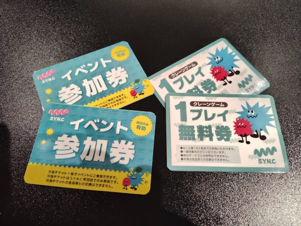 チケット購入後にイベント参加券やら、クレーンゲームの無料券をいただきました。これで公演までの時間調整もできますね。